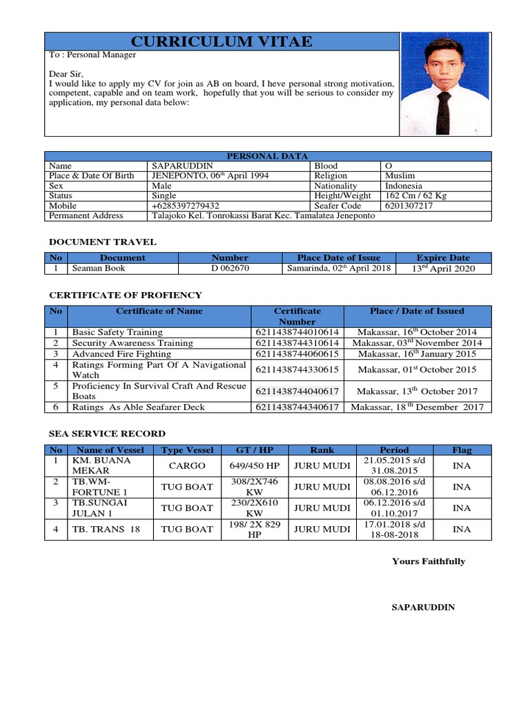 Search Q Contoh Cv Pelaut 2019 Tbm Isch from Tentunya sesuai regulasi pejabat kelautan, untuk merenew semua dokumen pelaut lima th sekali, tentu. 62 821 9876 5432 name of document number issued date expire date issuing authority. Begitu juga dengan perekrutan pegawai kelautan, cv pelaut merupakan salah satu hal yang harus disediakan oleh calon pegawai. Perhatikan ini tentunya sangat penting mengingat cv adalah salah satu berkas yang biasa diperlukan oleh calon pencari lowker pelaut. Begitu juga dengan perekrutan pegawai kelautan, cv pelaut merupakan salah satu hal yang harus disediakan oleh calon pegawai. Beranda / contoh cv pelaut engineer : Membuat cv pelaut yang menarik ialah hal yang penting dijalankan untuk para pelaut yang hendak mencari profesi. Pastikan ukuran file tidak lebih dari 2mb.